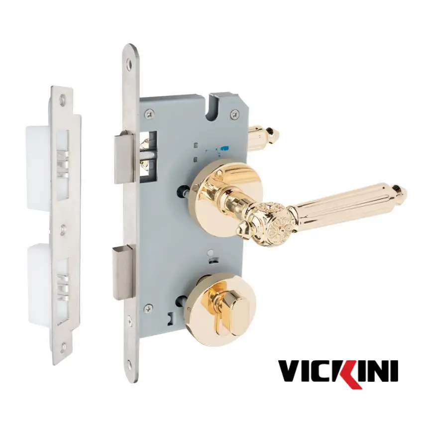 Khóa Cửa Phân Thể Vickini 34561.101 màu vàng được làm từ hợp kim kẽm mạ vàng cao cấp, sáng bóng, chống gỉ sét. Thiết kế tay gạt phân thể tinh tế, vận hành êm ái, phù hợp cho cửa phòng và nội thất sang trọng.