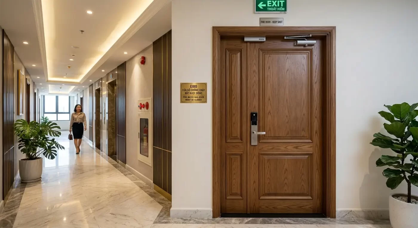Trong kiến trúc cao tầng hiện đại tại Nha Trang, các khu vực phòng kỹ thuật điện, nước hay phòng rác chính là những vị trí tiềm ẩn rủi ro hỏa hoạn cao nhất. Việc trang bị cửa gỗ chống cháy EI90 không chỉ nhằm tuân thủ nghiêm ngặt quy định PCCC mà còn là giải pháp bảo vệ an toàn hệ thống cho toàn bộ tòa nhà. Shopdoor tự hào cung cấp dòng cửa chống cháy chuyên dụng, kết hợp hài hòa giữa độ bền kỹ thuật sắt đá và thẩm mỹ nội thất sang trọng.