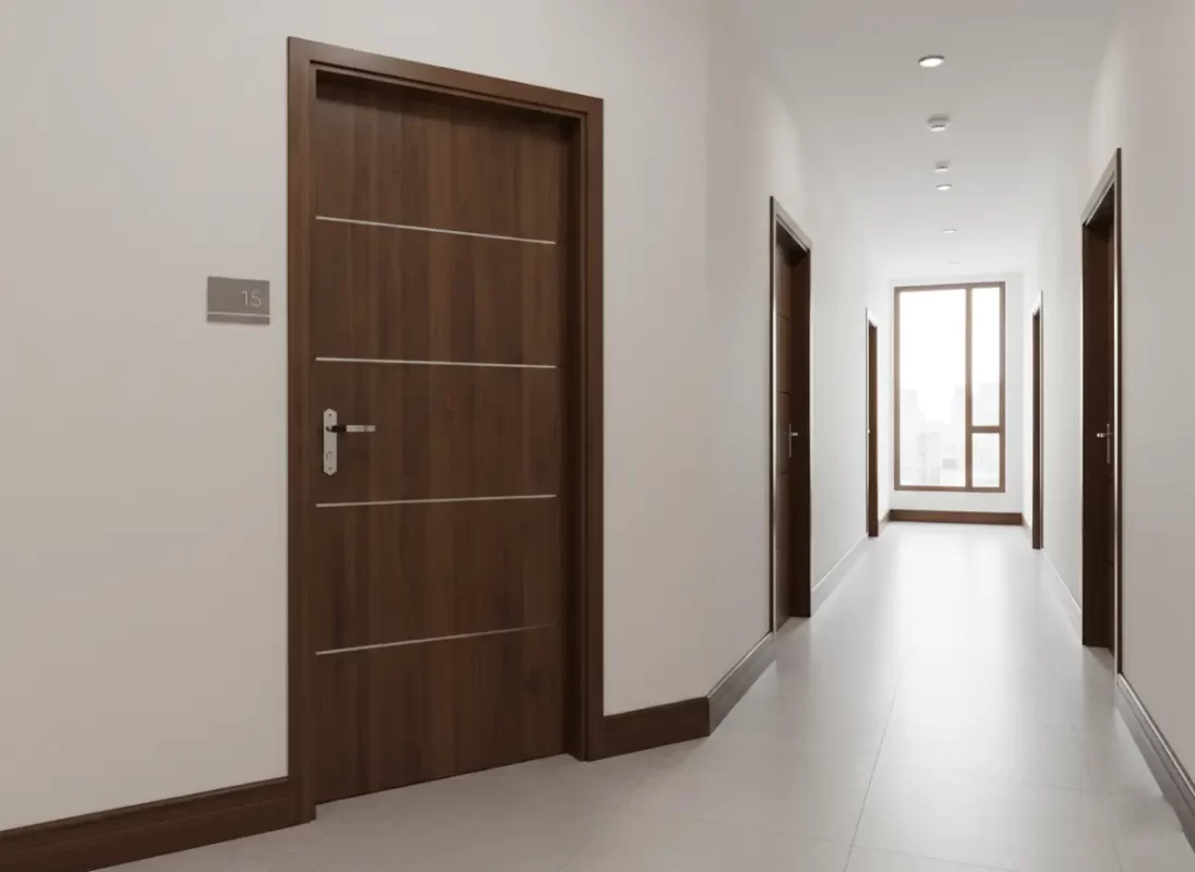 Ảnh tổng thể một bộ cửa gỗ công nghiệp chống cháy hoàn thiện tại căn hộ chung cư cao cấp.
